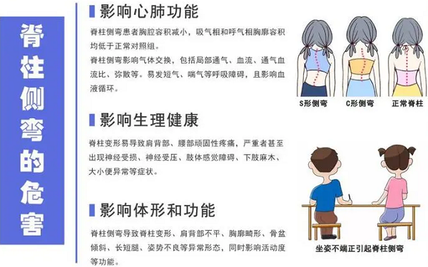 典型癥狀:輕度早期的脊柱側彎現象具有隱蔽性,初期是很難引起患者注意的。但是發育期的骨骼發展變化比較迅速,所以脊柱畸形的發展也很快,患者不僅會出現彎腰駝背的現象,還可能出現長不高、大小肩、胸部輪廓不對稱、脊柱偏離背部中線,嚴重地會出現“剃刀背”畸形,影響患者的心肺發育和呼吸系統,甚至引起神經癥狀。